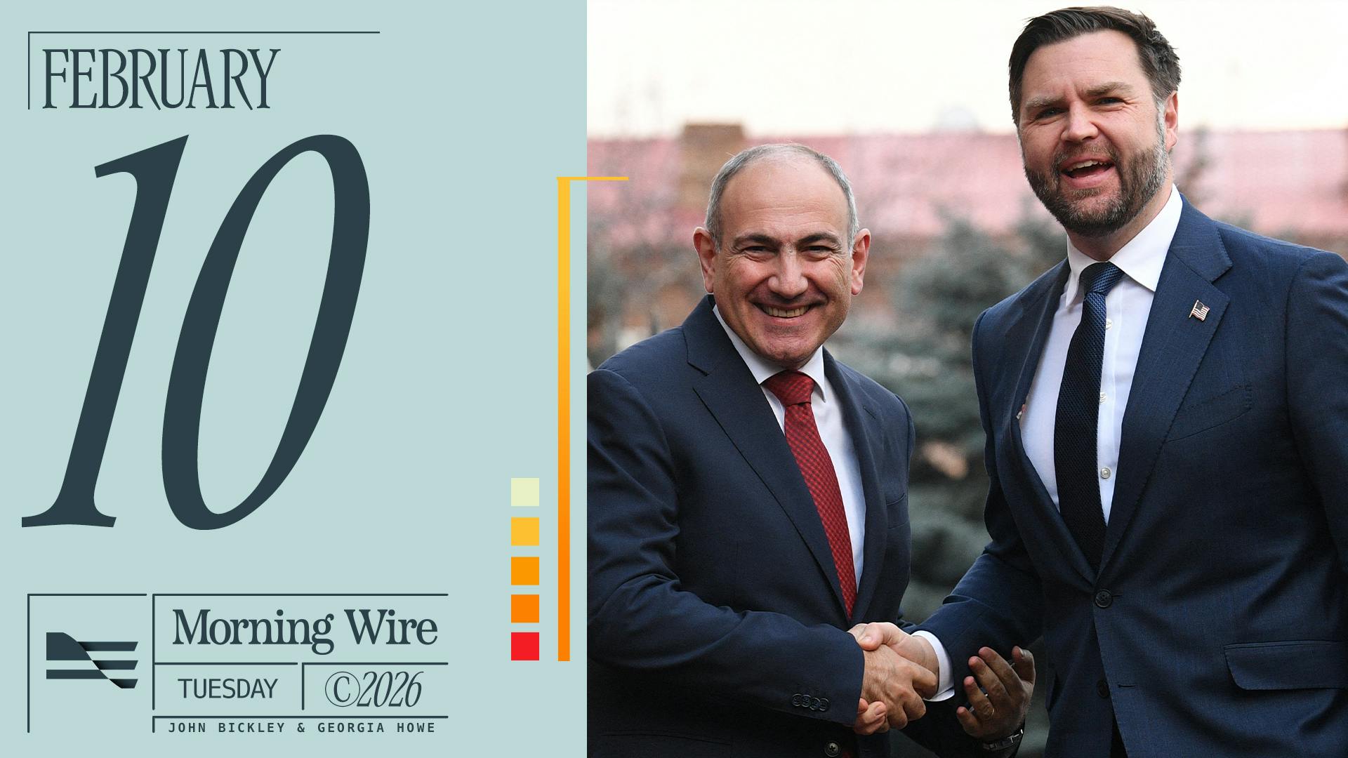 Morning Wire•Feb 10, 2026The latest release of FBI files reveals little evidence that Jeffrey Epstein ran a sex-trafficking ring, Vice President JD Vance becomes the highest-ranking American official to visit Armenia, and the Chinese government sentences pro-democracy British businessman Jimmy Lai to prison. Get the facts first with Morning Wire.
