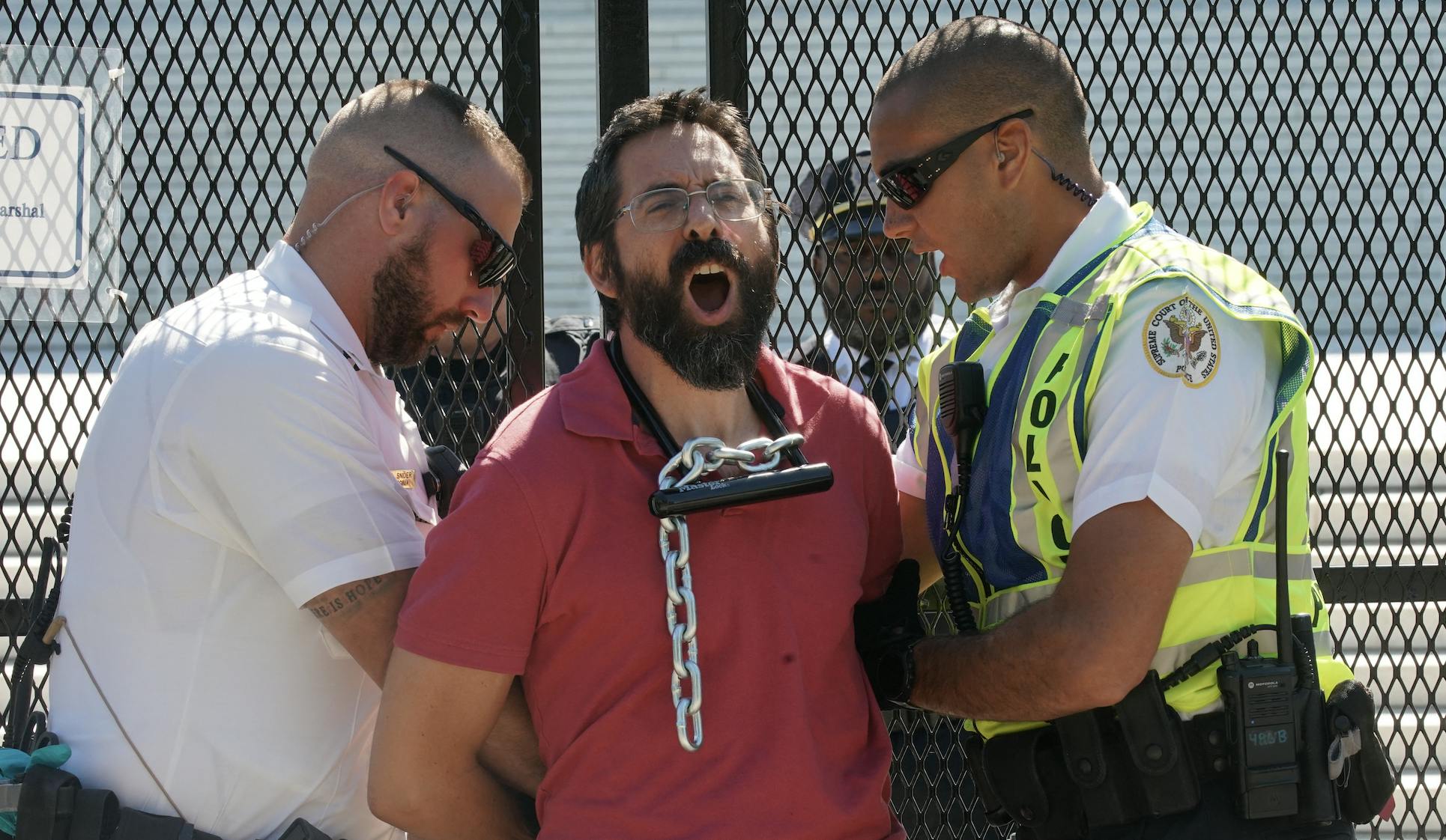 On the morning of June 6, a man identified as Guido Reichstadter had hopped over the barricades and chained himself to the unscalable fence surrounding the Supreme Court using a bike lock and chain. Then, as reporters and protestors watched, he took out pliers and attempted to break the key that went to the lock before throwing the key on the ground.