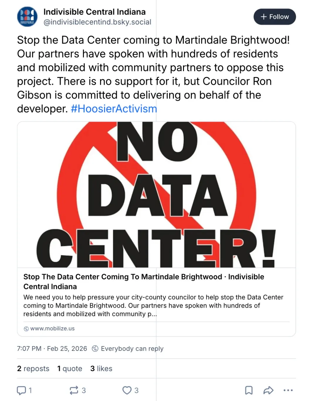 The group’s post on X was even more hostile towards Gibson. “There is no support for it [the data center], but Councilor Rob Gibson is committed to delivering on behalf of the developer.” The group added they had spoken with hundreds of residents and “mobilized with community partners to oppose this project.”