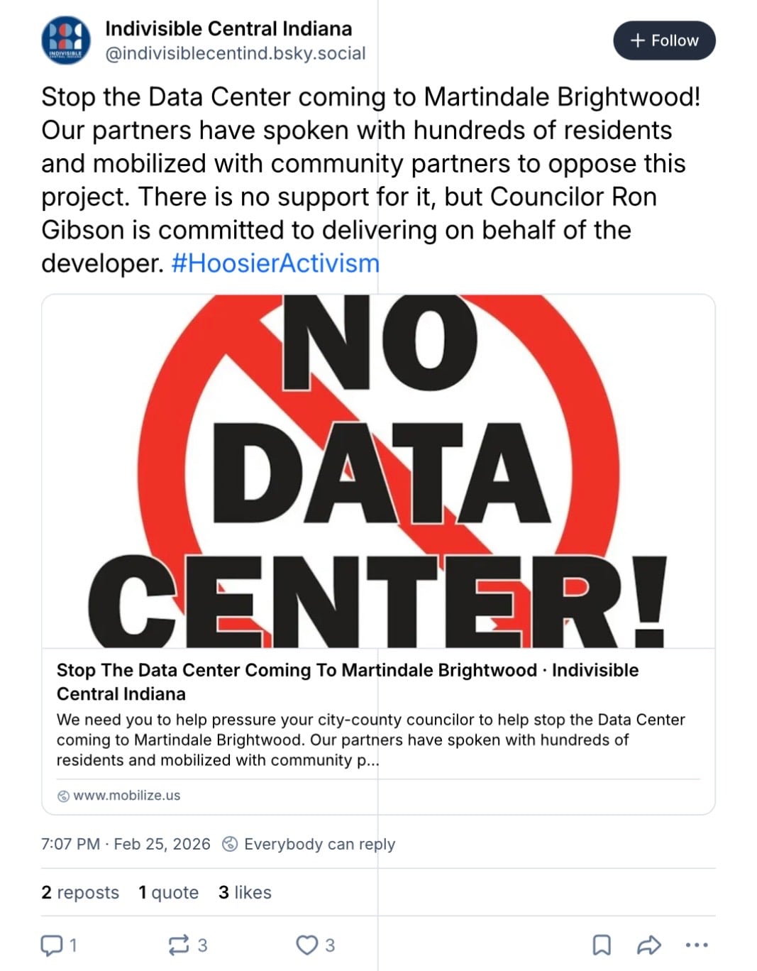 Social media posts reviewed by The Daily Wire show organizers encouraging residents to contact Gibson to opposed the data center. In one post, activists urged supporters to call residents and connect them with Gibson’s office to voice their concerns. The Indivisible Chapter for Central Indiana’s Facebook page urged allies to “bring a smartphone + charger,” adding, “Our dialing system provides scripts.” The group offered two days to join in for phone calls with “multiple slots” for people to sign up.