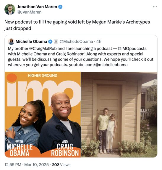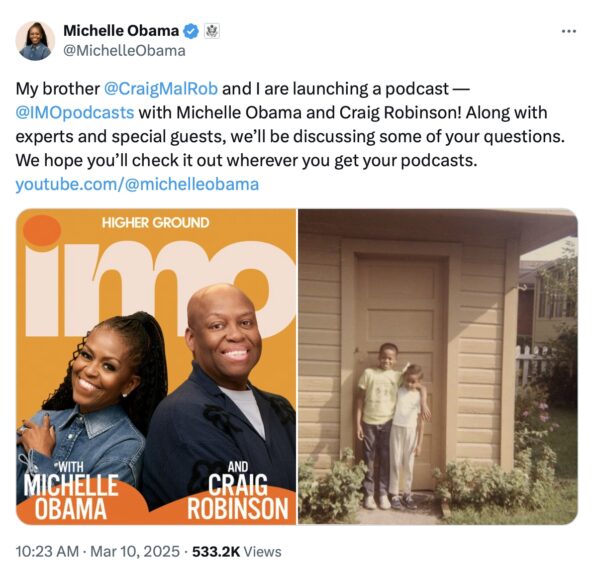 “My brother @CraigMalRob and I are launching a podcast — @IMOpodcasts with Michelle Obama and Craig Robinson! Along with experts and special guests, we’ll be discussing some of your questions. We hope you’ll check it out wherever you get your podcasts,” Obama wrote on X.