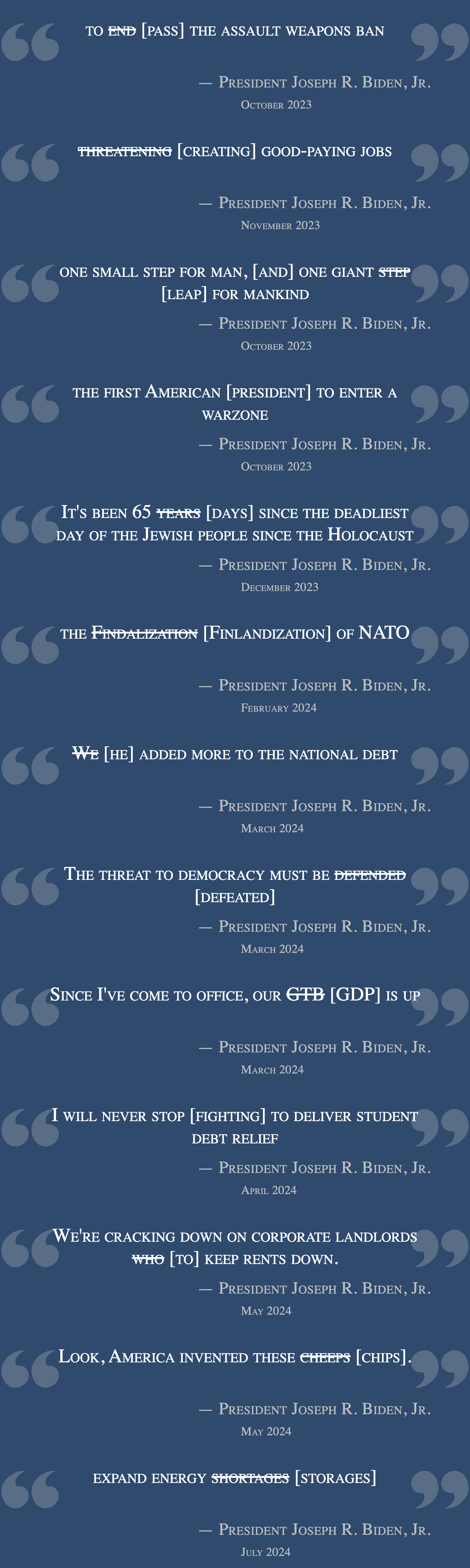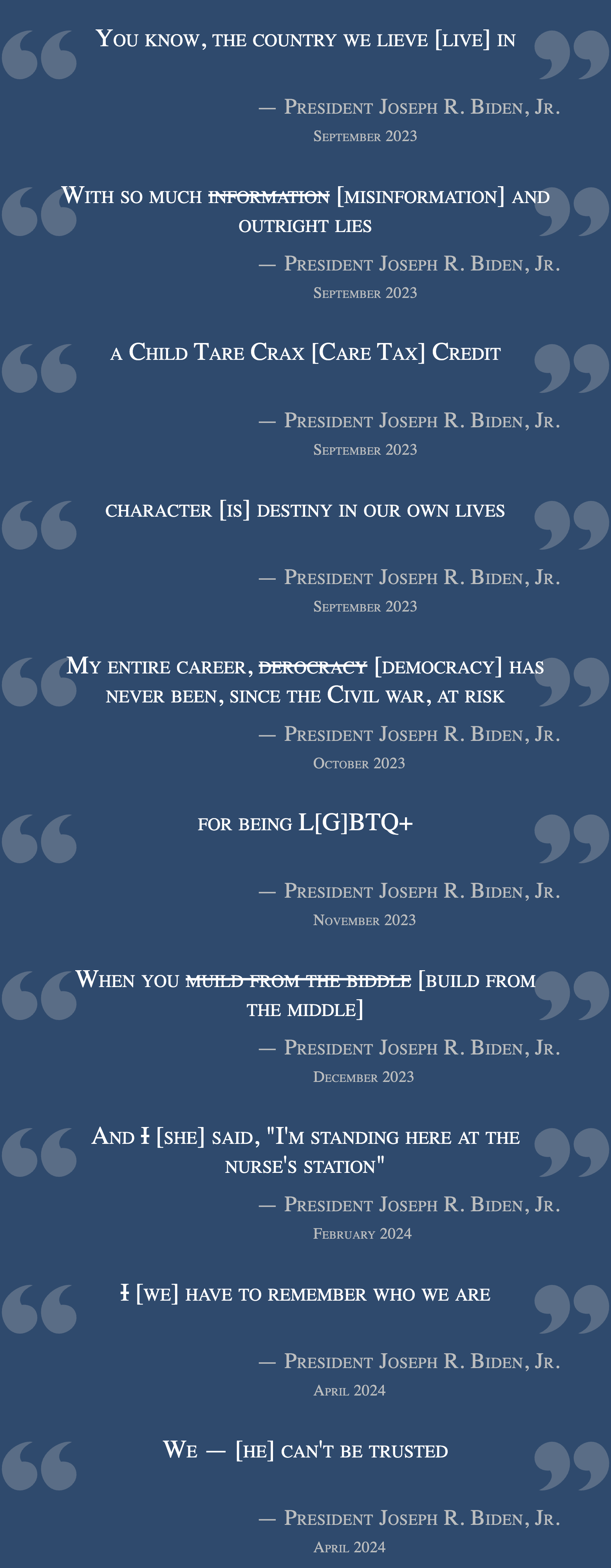 The mistakes together paint a picture of a man who blindly reads off of a teleprompter and is willing to say the words he believes are being fed to him even if they make no sense, such as that America invented something called “cheeps”, or that his administration did the opposite of what it wanted to do.