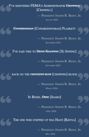 White House staff tasked with preparing transcripts of his “speeches and remarks” cross out Biden’s erroneous words — or insert the words he should have said using brackets. They had to do that a staggering 51 times in May 2024. The rate of errors per words spoken was one of the worst of his presidency, and he was whisked out of the public eye for much of June, speaking only half the number of words in official remarks that he normally does — until, of course, his cognitive difficulties captured the world’s attention at the June 27 debate.