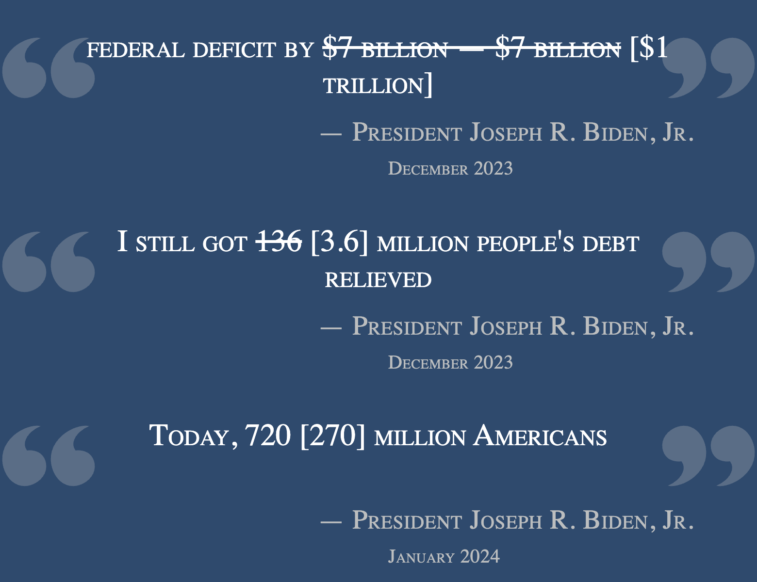 The officially-designated errors suggest that the man overseeing a multi-trillion dollar budget has difficulty communicating numbers. He routinely says numbers that are off by multiple orders of magnitude, when an awareness of basic facts such as the size of the federal budget or the population of the country would seemingly alert the speaker that they could not be right. He also repeatedly fails to distinguish the debt from the deficit, which are different terms with different meanings.