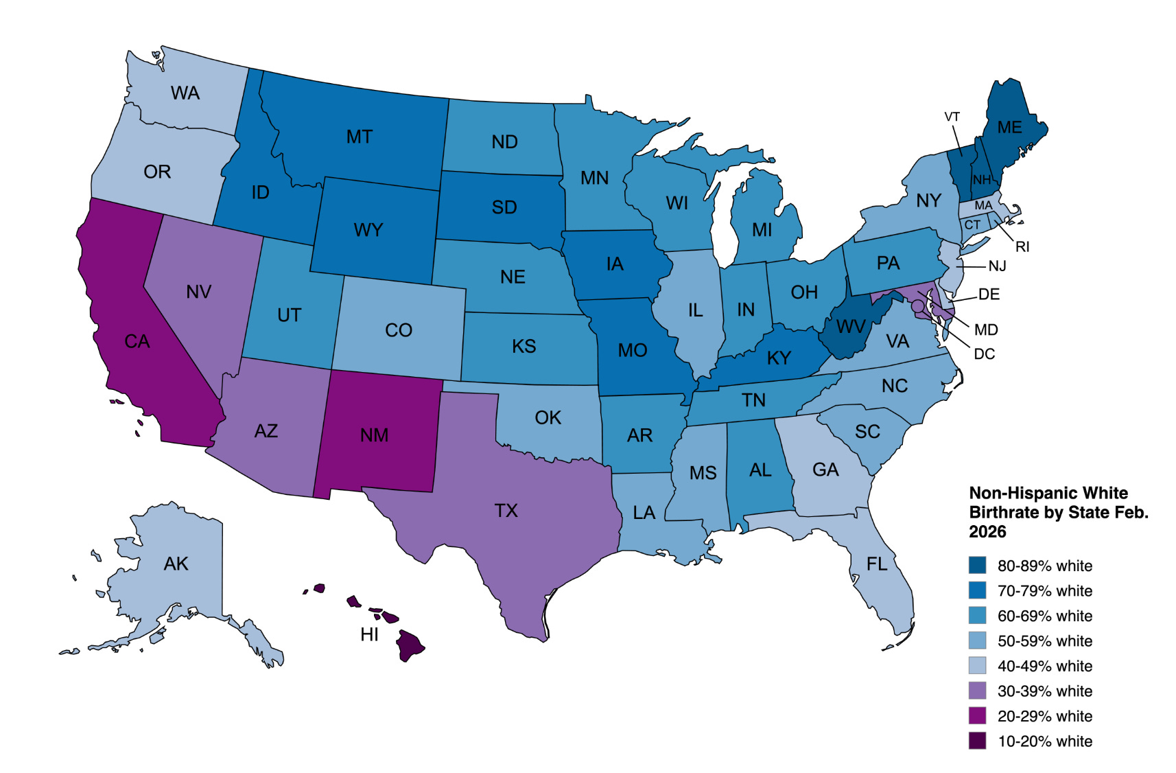 The decline in black fertility has been so large that many states with historically large black populations have more Latino births in February than black, including Virginia, North Carolina, and Tennessee. Other states like Arkansas and Maryland could very well see Latino births outpacing blacks by the end of the year or the beginning of next year.