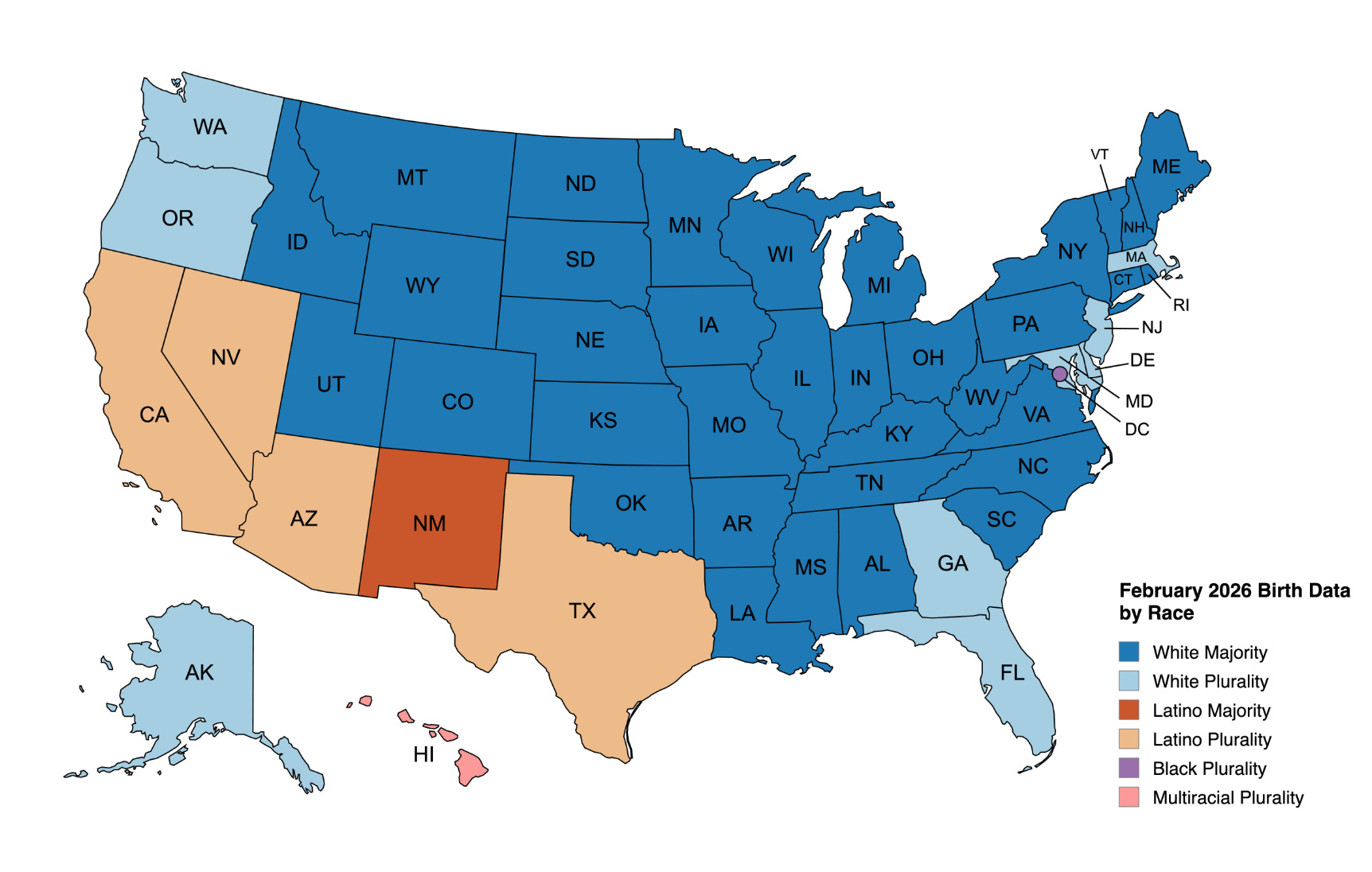 Whites accounted for a majority of births in 34 states and a plurality in nine states. Latinos were a plurality of births in four states and a majority in one. The District of Columbia was plurality non-Hispanic black, and Hawaii was the only state where multiracial births were the plurality.