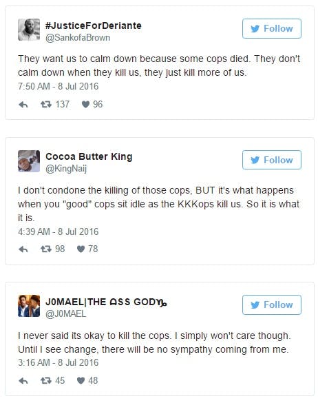 “They want us to calm down because some cops died. They don’t calm down when they kill us, they just kill us more,” wrote @SankofaBrown.