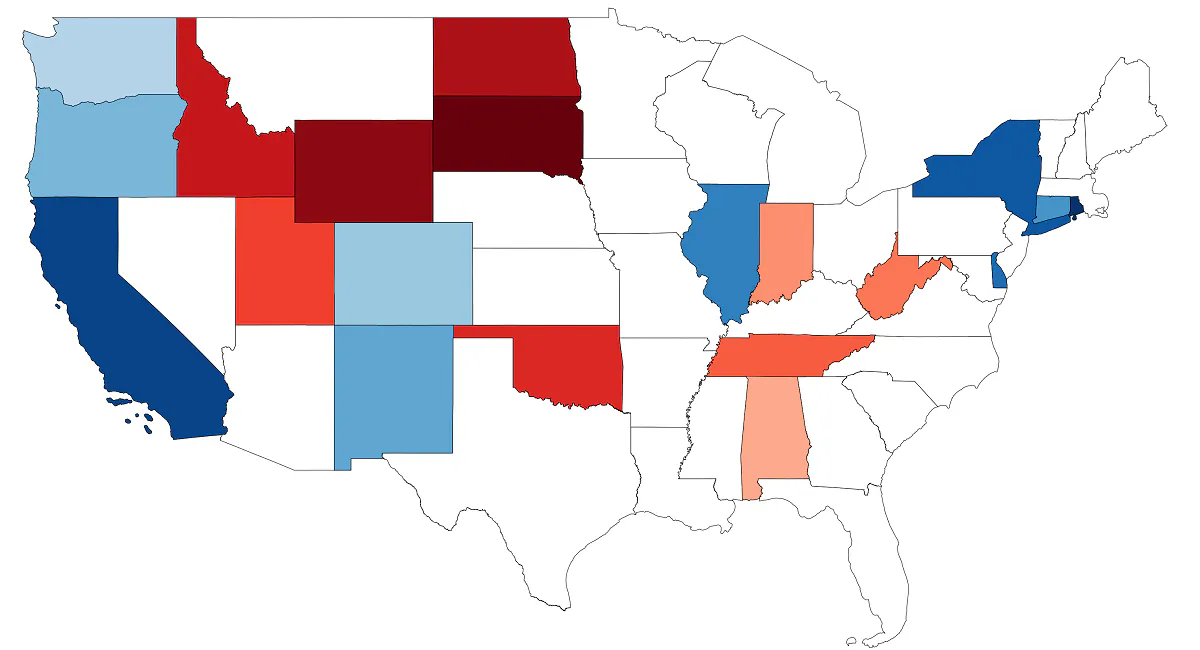 The Daily Wire focused on the 10 most-liberal and 10 most-conservative states by selecting those where one party controlled the legislature and governor’s mansion, and ordering them by the share of state legislature seats controlled by that party. Hawaii was the most liberal state, with 93% Democrats in its legislature, but it was excluded because it is not part of the mainland and is subject to unique economic forces.