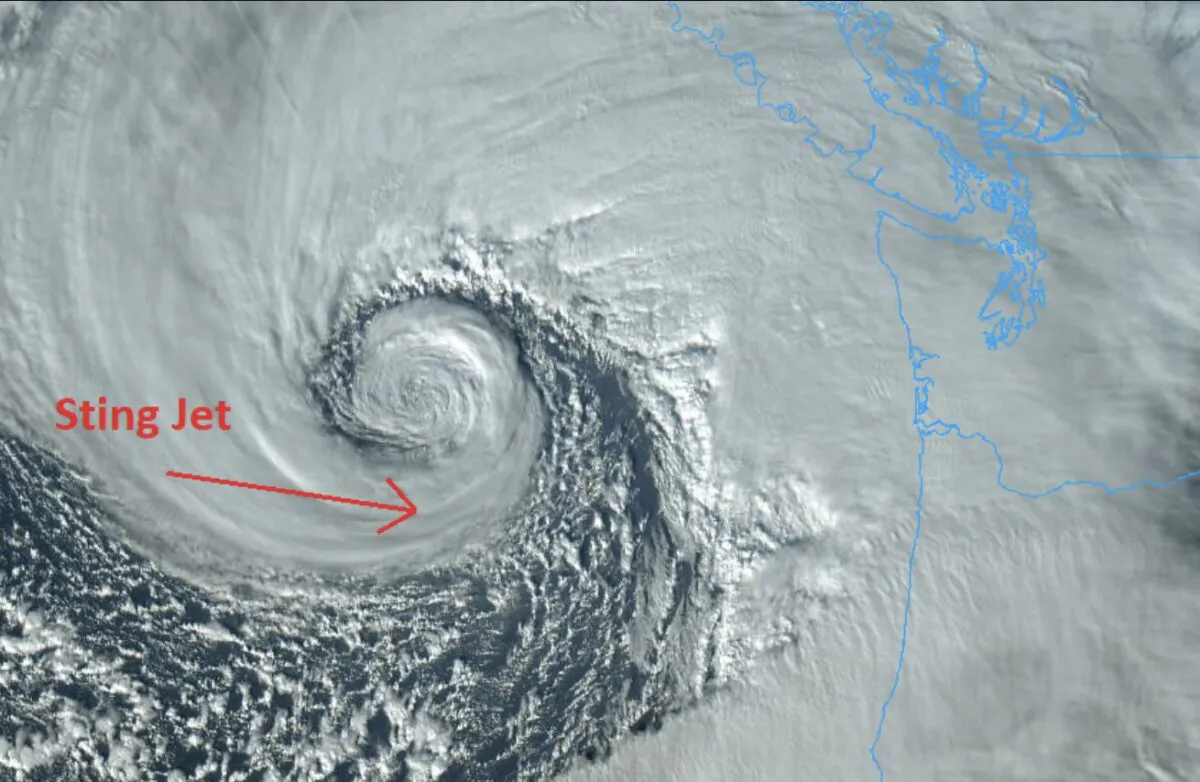 In a post to X, the National Weather Service (NWS) pointed to the swirl and said that some “of the most powerful winds with the strong low pressure offshore are often in a region called the ‘Sting Jet’ (not a Police tribute band). Also known as the ‘Poisonous Tail’ – it’s where strong winds form as colder dense air rapidly descends and dries.”