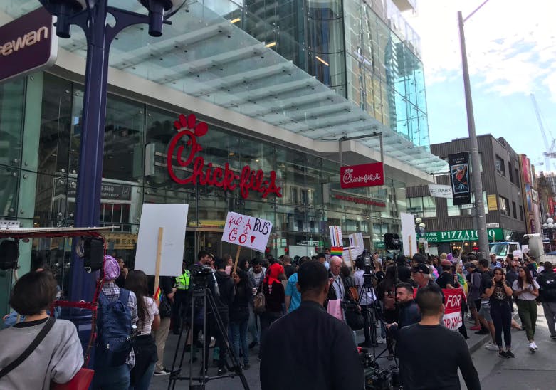 “Many U.S. cities, campuses, and retail outlets have refused to allow Chick-fil-A to locate within their spaces, and/or have been vocal opponents of the corporation’s hateful values,” the statement continued. “Toronto and the rest of Canada need to be next in line.”