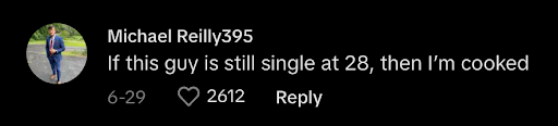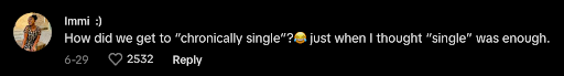 Interestingly, the last comment is from the 25-year-old single woman who got a jump on the beginning of this trend. This is definitely one way of “putting yourself out there” that I can get behind because, who knows, maybe these two could meet and bond over this. I am all in favor of a TikTok romance.