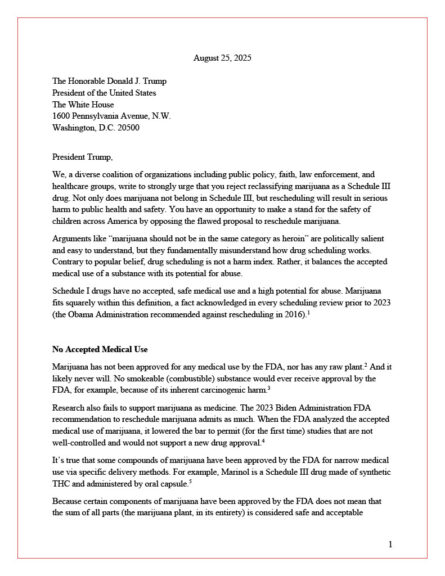“You have an opportunity to make a stand for the safety of children across America by opposing the flawed proposal to reschedule marijuana,” the letter states.