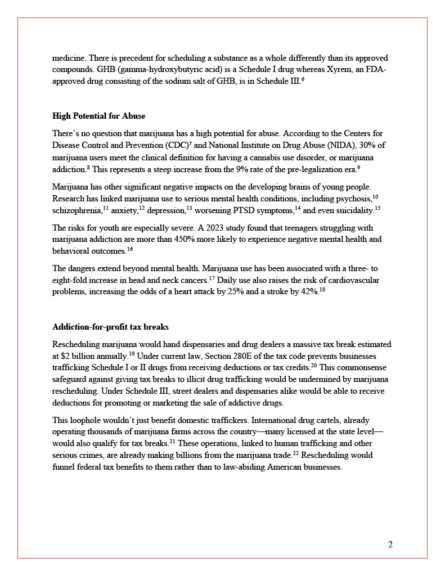 “Arguments like ‘marijuana should not be in the same category as heroin’ are politically salient and easy to understand, but they fundamentally misunderstand how drug scheduling works,” the letter continues. “Contrary to popular belief, drug scheduling is not a harm index. Rather, it balances the accepted medical use of a substance with its potential for abuse. Schedule I drugs have no accepted, safe medical use and a high potential for abuse. Marijuana fits squarely within this definition, a fact acknowledged in every scheduling review prior to 2023 (the Obama Administration recommended against rescheduling in 2016).”