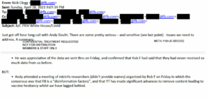 “Andy attended a meeting of misinfo researchers (didn’t provide names) organized by Rob F on Friday in which the consensus was that FB is a ‘disinformation factory,’ and that YT has made significant advances to remove content leading to vaccine hesitancy whilst we have lagged behind,” Clegg continued.