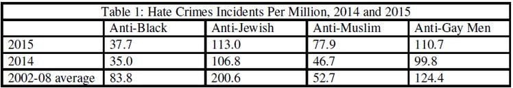 Of the four groups, Muslims saw the largest increase in hate crime assaults from 2014 to 2015, from 10.9 to 19.4 per million. The average from 2002-2008 was 12.3 assaults per million.
