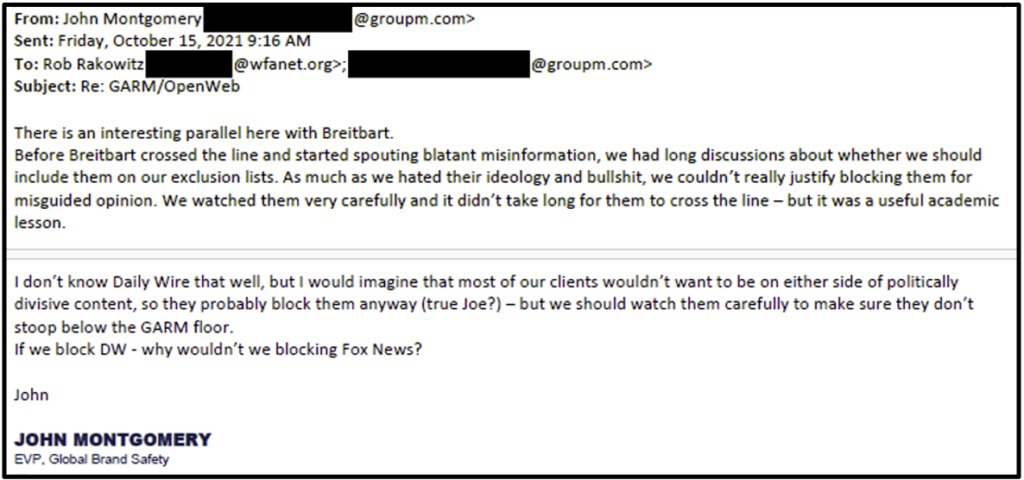 “There is an interesting parallel here with Breitbart,” Montgomery wrote in an October 2021 email after he was asked about The Daily Wire. “Before Breitbart crossed the line and started spouting blatant misinformation, we had long discussions about whether we should include them on our exclusion lists. As much as we hated their ideology and bulls**t, we couldn’t really justify blocking them for misguided opinion. We watched them very carefully and it didn’t take long for them to cross the line.”