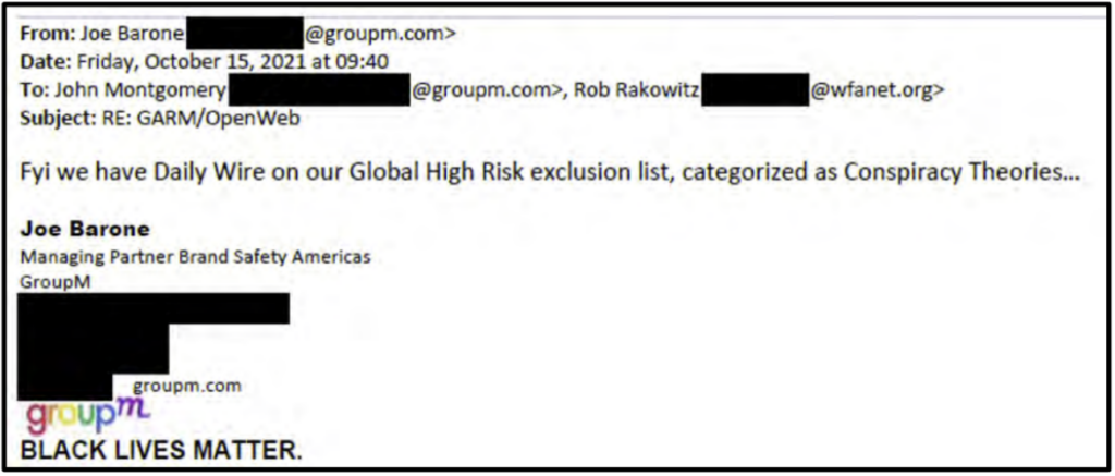 One of the lead organizations in the coalition, GroupM, the world’s largest media buying agency, admits in emails that The Daily Wire is “on our Global High Risk exclusion list, categorized as Conspiracy Theories.”