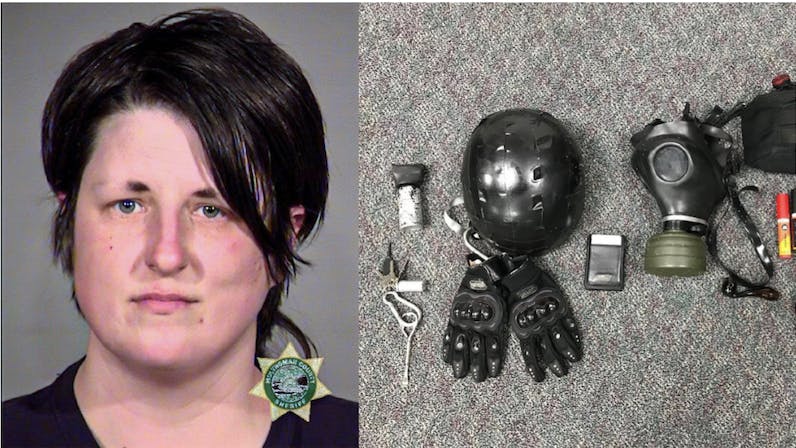 Loomis was arrested in full riot gear that included a gas mask, a black helmet, and fiberglass-enforced gloves. Loomis, who has an Antifa tattoo on her chest and was in a “black bloc” uniform popular with Antifa, was carrying bear mace and a steel tool, according to police.