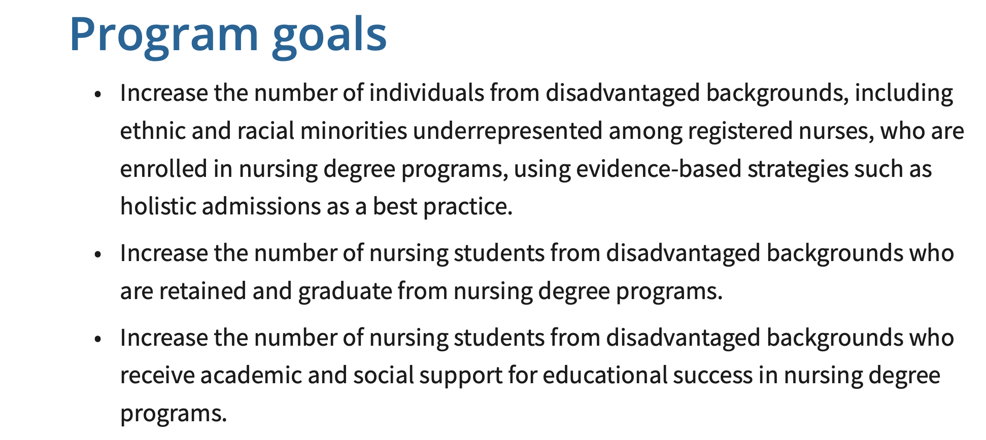 Applicants are required to present “evidenced-based strategies used to recruit and retain students from underrepresented or disadvantaged backgrounds” and “include the implementation of holistic admissions, provision of scholarships and stipends to address socioeconomic barriers, and peer and mentor support to provide wraparound services to assist in student success.”