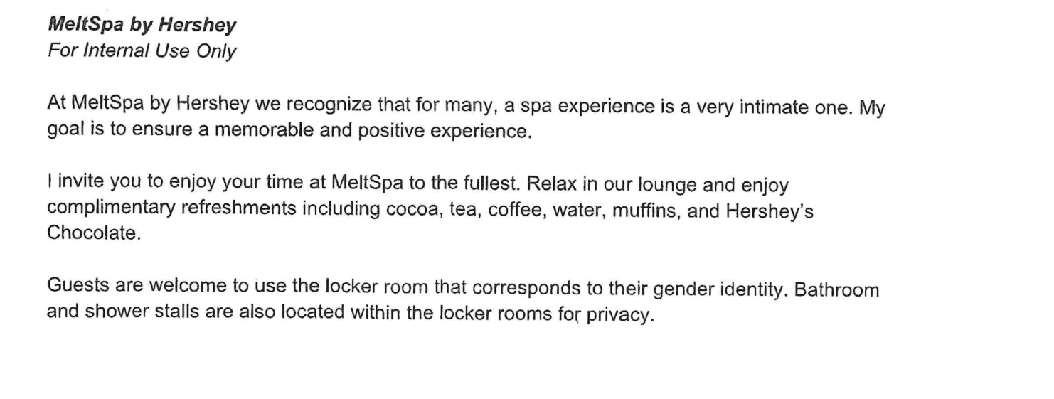The suit says that Jeriah Sellers, a devout Christian, was told to leave her faith at the door after she informed her supervisor that she was uncomfortable bringing a male into the female locker room at the Melt Spa by Hershey in Pennsylvania. As a result of her request not to be forced to bring males into female spaces, Sellers says that she was suspended without pay for a shift and slapped on the wrist by the company’s HR department.