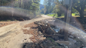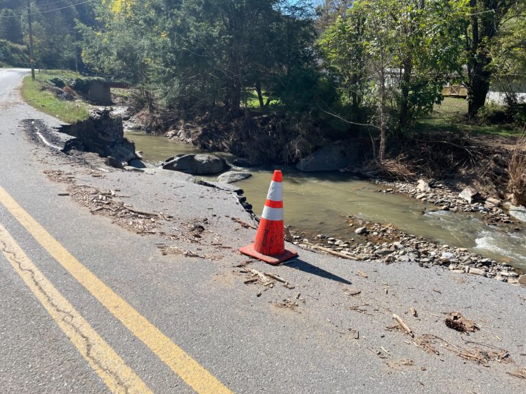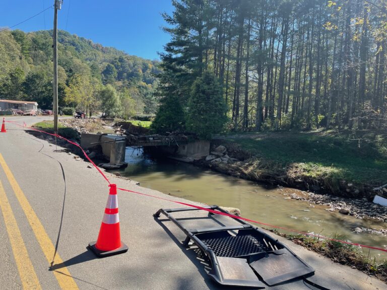 In the immediate aftermath, the residents of Roan Mountain looked after themselves. Anyone with heavy equipment worked to clear roads, rebuild bridges, and rescue those trapped by flood. Orange cones and caution tape now mark spots where the flood took chunks out of the town’s streets. In some patches, the road has disappeared altogether, only to be replaced by dirt and rocks by locals with the equipment to manage the rushed repairs.