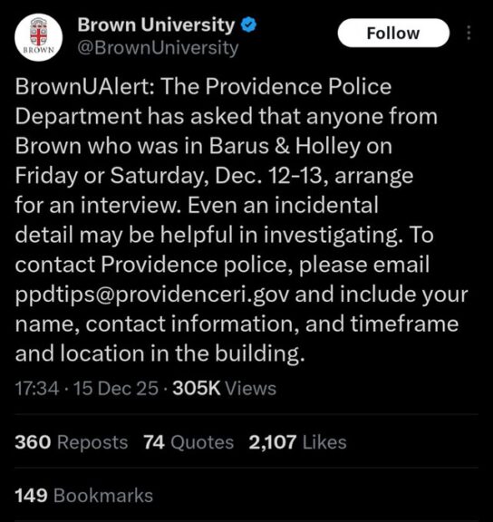 Brown University, the Ivy League school in Providence, Rhode Island, has now crossed the threshold into extreme incompetence that’s indistinguishable from malice. So have local authorities in Providence, as well as any federal authorities who are working on the case. On Saturday at 4:00 PM, nearly five days ago, a gunman shot 11 people on the campus of Brown University. One of the two victims who died was the vice president of the university’s chapter of the College Republicans. There are reports that she may have been targeted, and that she was shot multiple times at close range. And in the aftermath of this mass shooting and possible political assassination, the university and the authorities have bungled the case so flagrantly, so many times, that they may as well be working with the shooter.