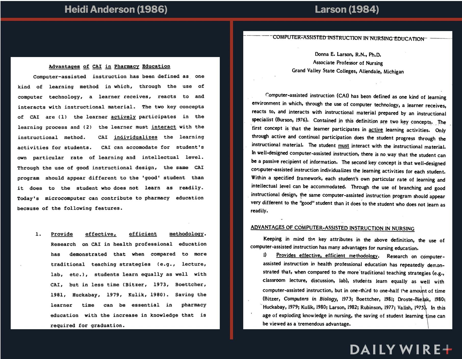 Portions of the dissertation, which deals with the use of computers in pharmaceutical education, appear to be a repurposed and uncredited copy of a 1984 paper by Donna E. Larson, a professor of nursing, about the use of computers in nursing education, with simply the name of the field changed. The below photos show just the beginning of a lengthy section where Anderson appears to crib Larson’s eight points.