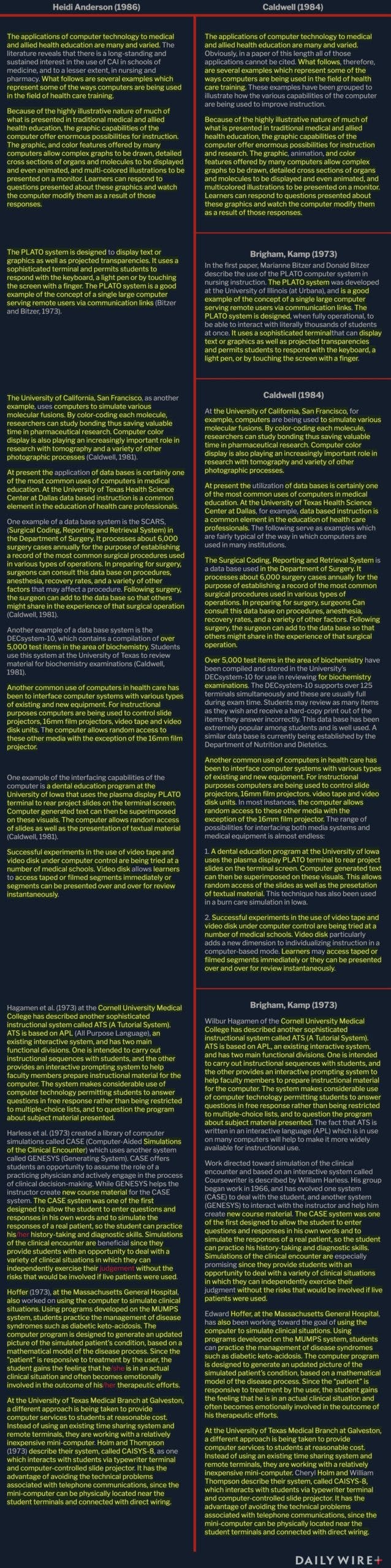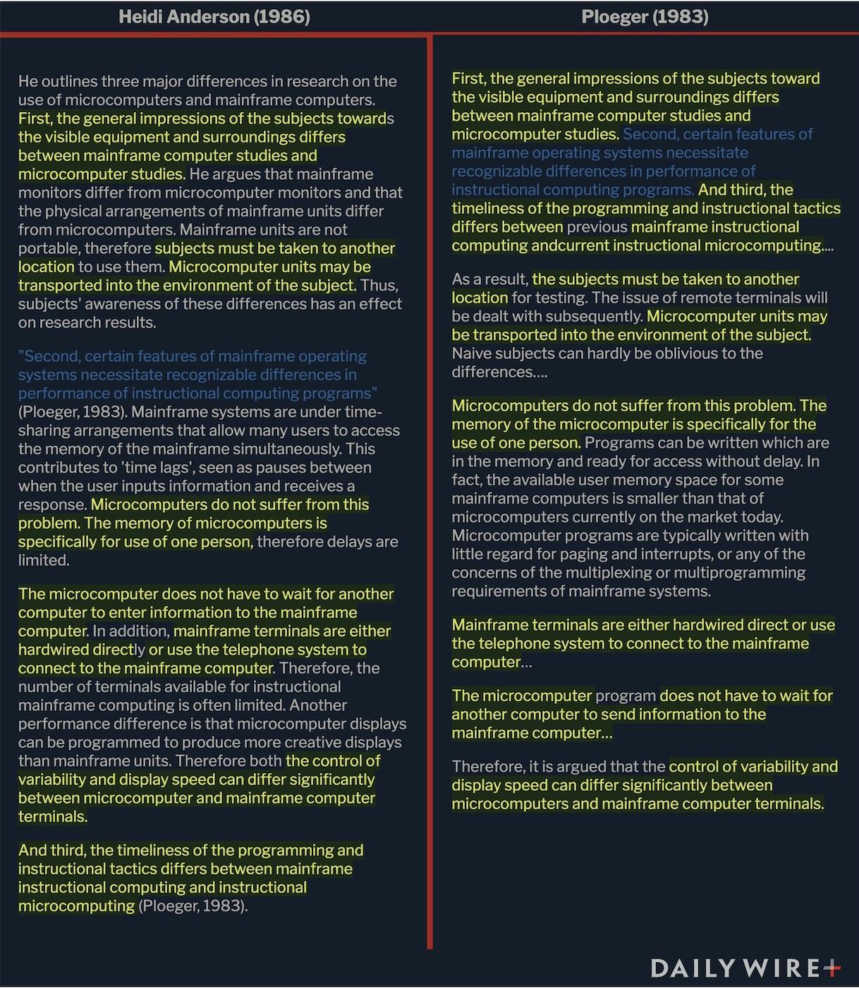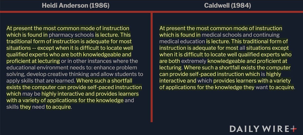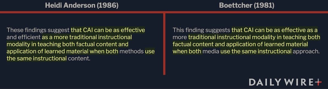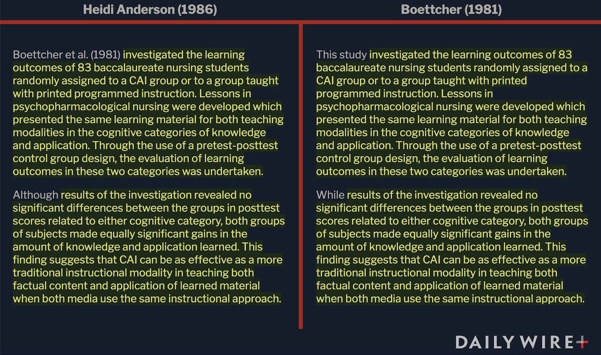 Startlingly, the conclusion of her original research also appeared to be copied from someone else. “These findings suggest that CAI can be as effective and efficient as a more traditional instructional modality in teaching both factual content and application of learned material when both methods use the same instructional content,” she wrote. That was virtually identical to a sentence that Elaine G. Boettcher wrote five years prior.