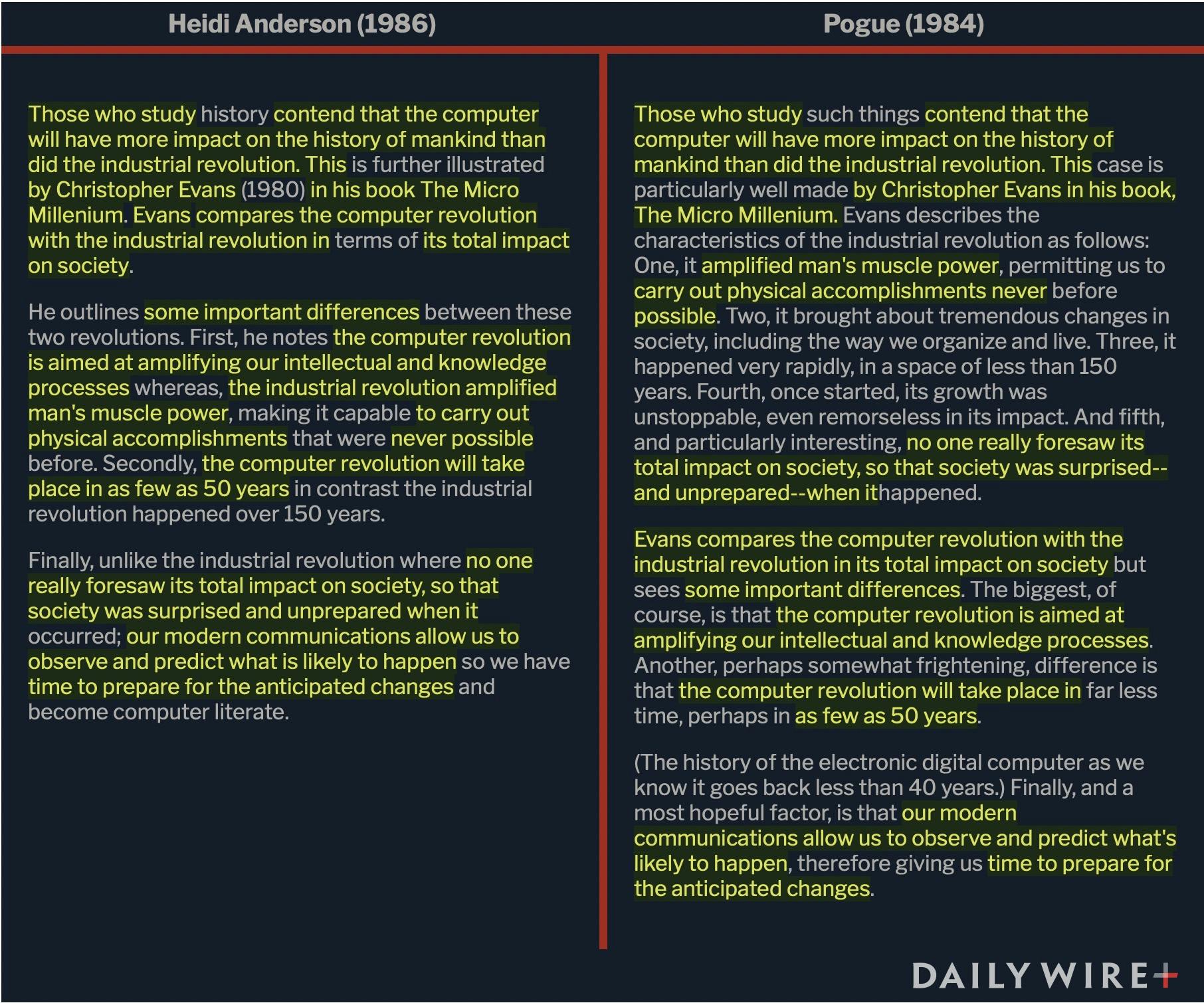 When Anderson summarizes a book by Christopher Evans, she is actually copying someone else’s summary of Evans’s work, even though there is no parenthetical attribution in that section of the text indicating it. The summary on the right, by Richard E. Pogue, was from the introduction to the same journal issue where Larson’s paper appeared.