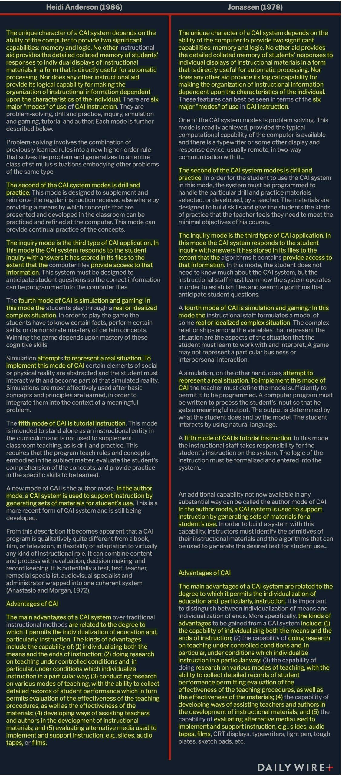 A significant stretch of Anderson’s paper is identical to “Introduction to Instructional Media” (1978) by David H. Jonassen, even though Jonassen’s name never appears in her paper. That includes mirroring Jonassen’s language that something was “recent” in the world of computers, without the reader knowing that it was actually new almost a decade prior.
