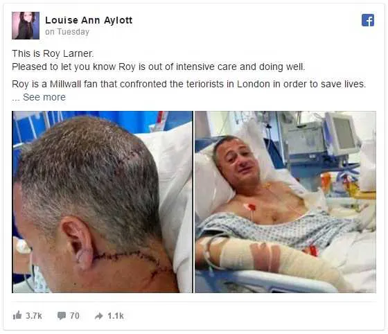 Meet Roy Larner, the fearless, hilarious 47-year-old who responded to the London Bridge jihadists bursting into the Black & Blue pub by taunting and then fighting all three of the 12-inch blade-carrying murderers with his bare fists. He lost the fight, but it was the terrorists who ended up losing their lives moments later. Despite being stabbed eight times by the cowardly radical Islamists, Larner survived — as did his self-deprecating sense of humor and love of the Lions football club.