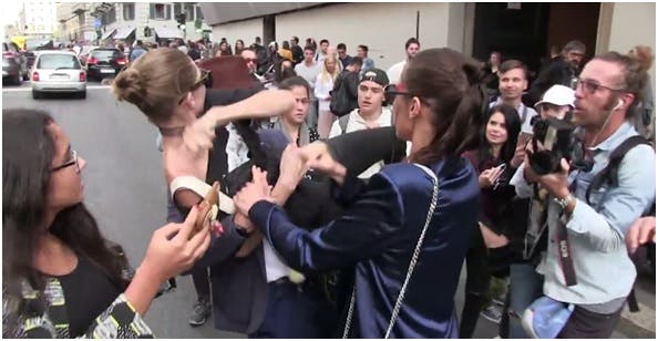 As the coward ran off, the young model even attempted to go after him herself, before being pulled away by her less-than-secure security guard.