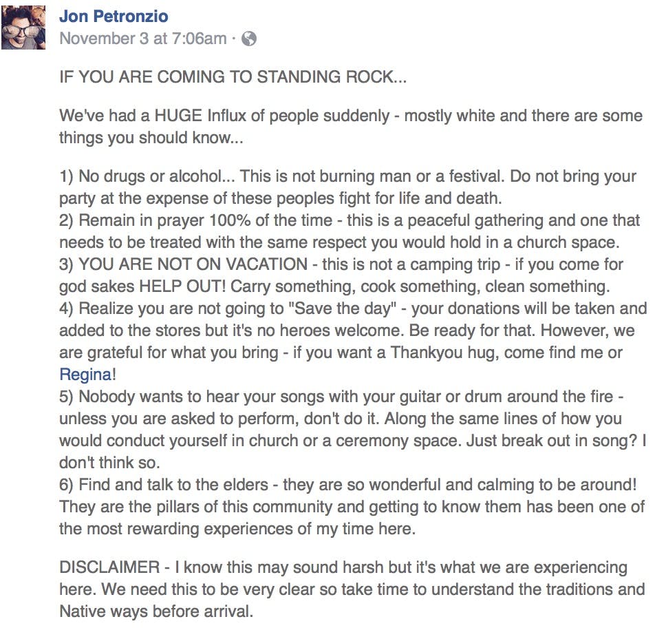 On my way back from the camps. Need to get something off my chest that I witnessed and found very disturbing in my brief time there that I believe many others have started to speak up about as well. White people are colonizing the camps. I mean that seriously. Plymouth rock seriously. They are coming in, taking food, clothing and occupying space without any desire to participate in camp maintenance and without respect of tribal protocols. These people are treating it like it is Burning Man or The Rainbow Gathering and I even witnessed several wandering in and out of camps comparing it to those festivals.