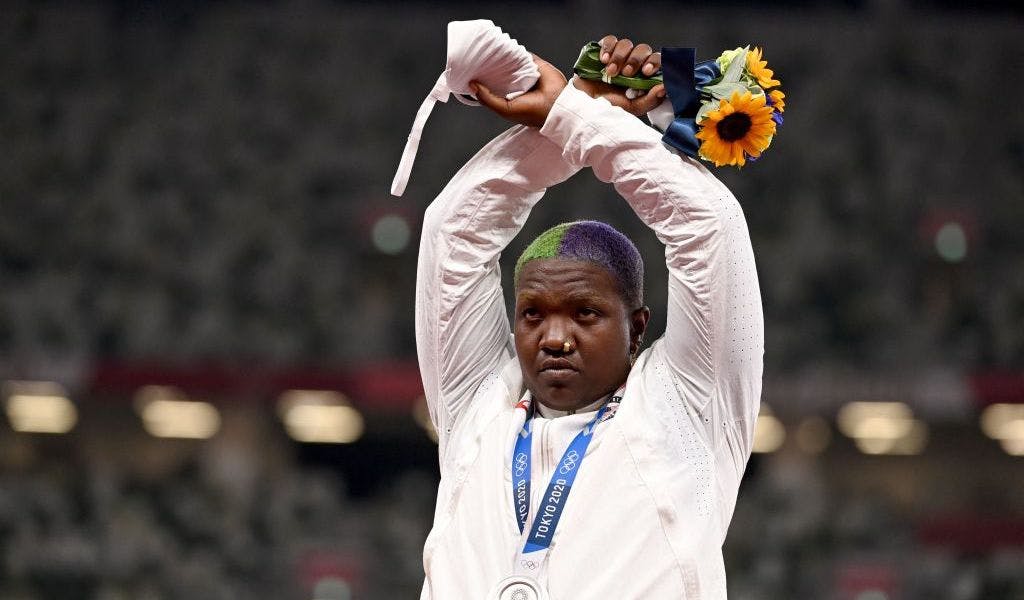 Several U.S. athletes sought to use their platforms as Olympic athletes to push activist messages. Shot putter Raven Saunders won a silver medal at the games and used her time on the podium to protest in support of the oppressed “all over the world” by crossing her arms over her head in an “X” during the medal ceremony.