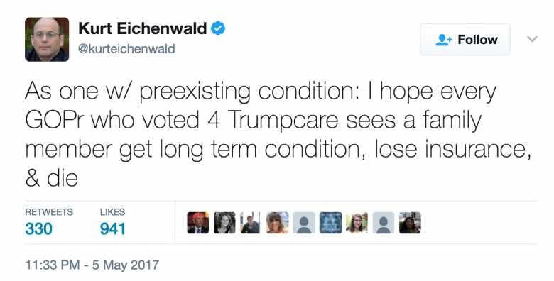 After the House Republicans passed the American Health Care Act (AHCA) on Thursday, Newsweek‘s Kurt Eichenwald wrote a series of tweets indicating that members of the GOP and their family members should die. He deleted many of these tweets, but The Daily Caller‘s Peter Hasson managed to capture many of them.
