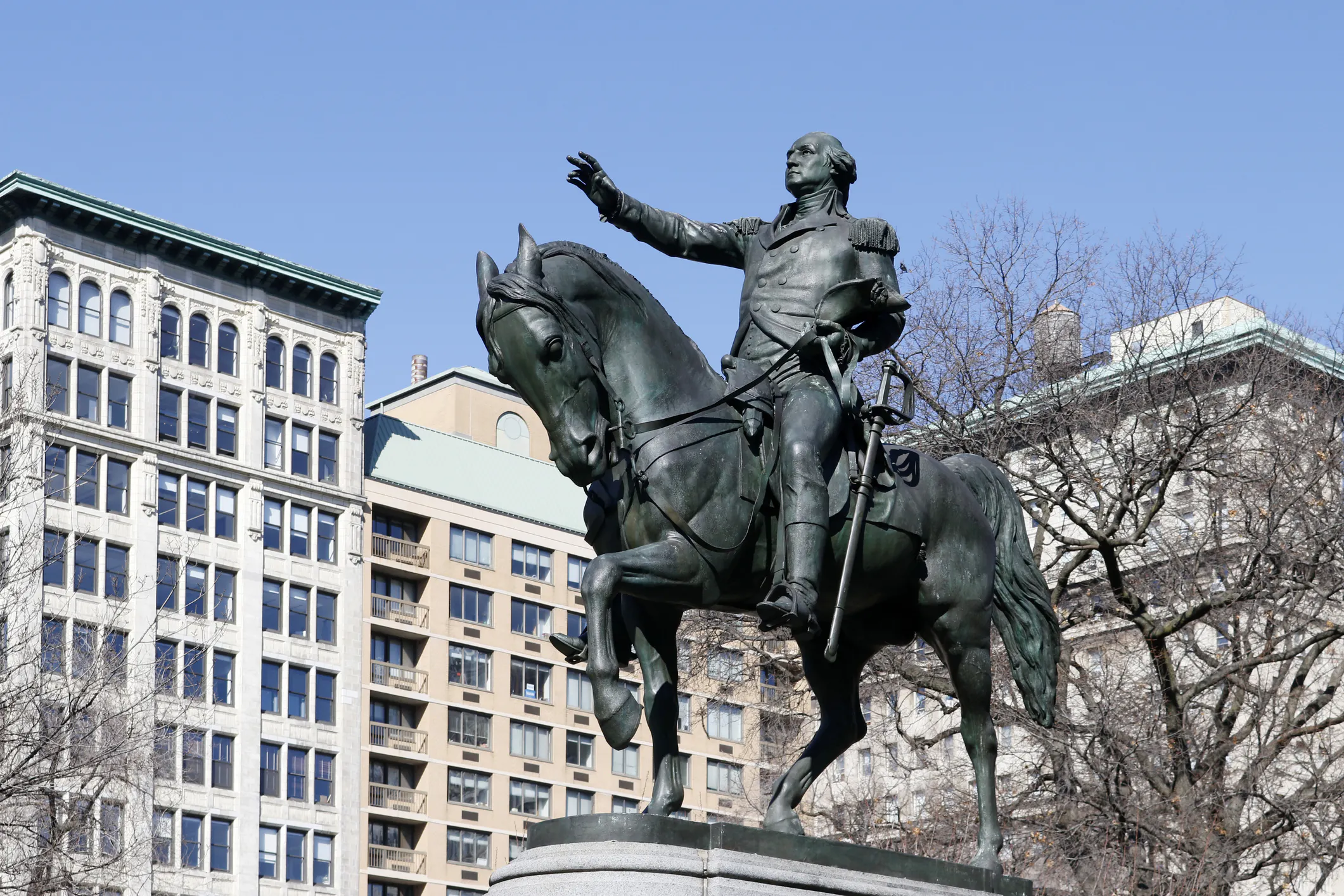 There are multiple statues of Washington, the nation’s first president and military commander during the war for independence throughout the city, including one in front of Federal Hall, which served as the home to the nation’s first Congress, executive branch offices, and Supreme Court. There are also monuments to Washington in Union Square Park and a statue of Washington and Frenchman Marquis de Lafayette who fought with the Americans during the American Revolution.