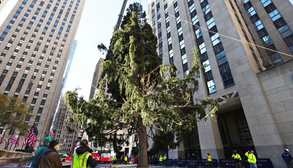 This year, tree keepers picked a giant Norway spruce in Oneonta, New York, to erect in Midtown Manhattan. The 75-foot tree arrived on Saturday with a police escort and was lifted into position by crane.