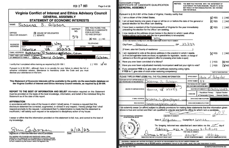 The signature issue is different because Gibson’s husband, John David Gibson, practices law in neighboring Louisa County, which is where the notary says she witnessed Gibson sign the form.