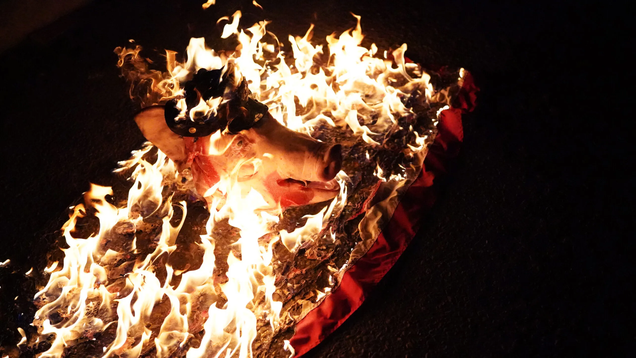 Antifa protesters dumped a bloody severed pig's head on an American flag outside the Justice Center in downtown Portland. They put a cop's hat on it and set all of it on fire. #PortlandRiots #antifa pic.twitter.com/qfAOT4ItxP