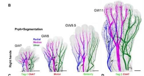 3D imaging depicting peripheral nerve development between 7 and 8 weeks of gestation.
