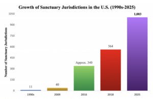 “Our findings reveal that, prior to 2000, only 11 jurisdictions had adopted sanctuary policies. By 2009, that number had grown to 40,” FAIR says as it charts the growth in its report. “In 2016, it had surged to over 300, and by 2018, FAIR identified 564 jurisdictions as noncooperative.”