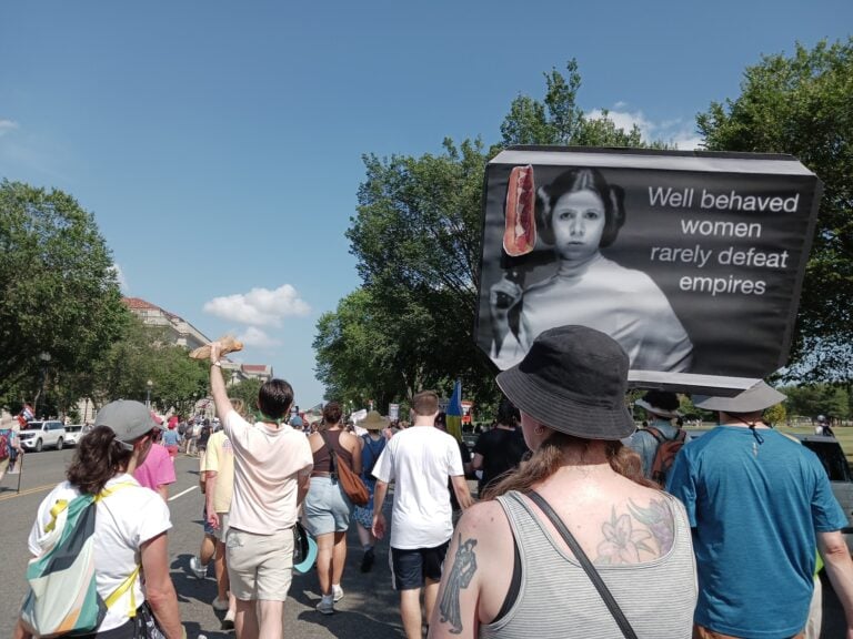 The protesters themselves did not always match the seriousness of their rhetoric. One protester brandished a baguette, while another held a poster of Princess Leia holding a sub sandwich instead of a gun.