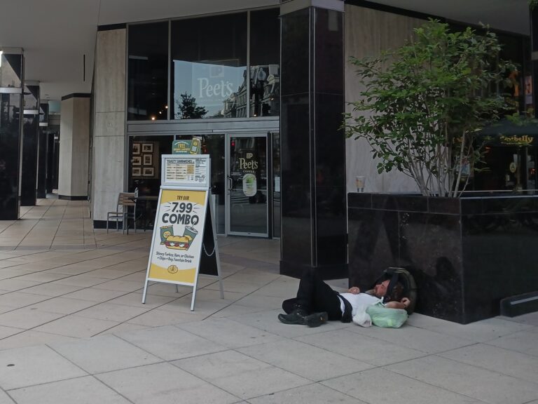 After the protest began to disband, this reporter went to find some water and had to step around a homeless man sleeping in front of a Peet’s Coffee across the street from the White House.