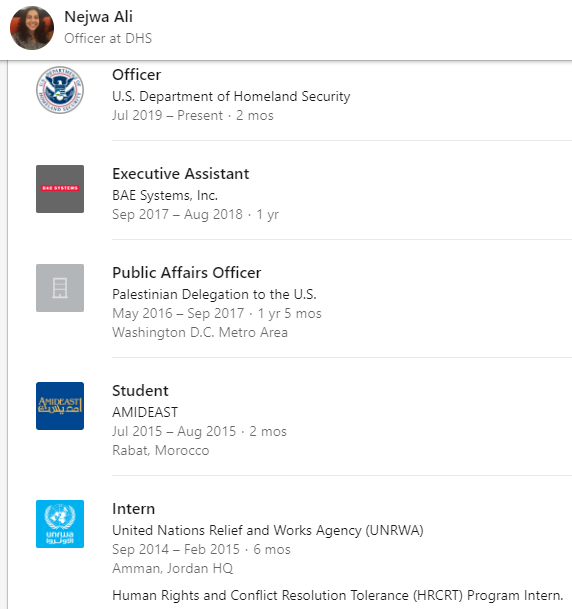 Nejwa Ali worked in 2016 and 2017 as a public affairs officer for the Palestinian Delegation to the U.S., which according to its own website, served as the “PLO office in D.C.” That office was expelled from the country by the Trump administration, but Ali landed on her feet, according to a screenshot of her LinkedIn profile, securing a job at DHS as an “Asylum Officer,” where she was tasked with “applying immigration laws and regulations to asylum applications.”