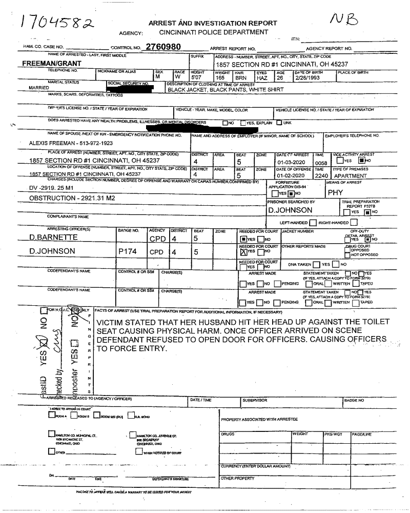 Grant Freeman, who now uses the name of his ex-wife “Alexis,” was charged with domestic assault after he was arrested by police for slamming his wife’s head against a toilet seat. When officers got to the scene, Freeman refused to let them in causing the officers to force entry, the police report shows.
