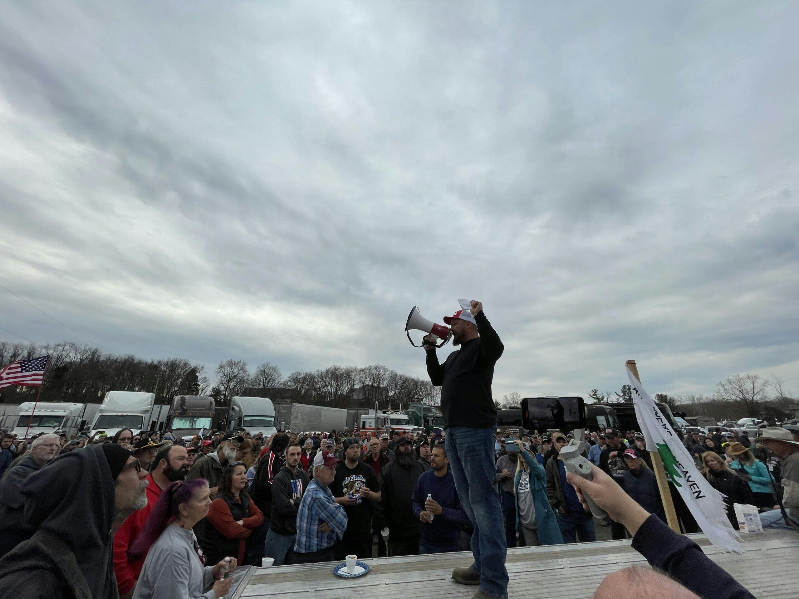 Organizer Brian Brase spoke to members of the convoy early Monday morning at Hagerstown Speedway in Maryland, where the convoy had camped out for the night. Brase told the assembled crowd that the convoy would not be entering the capital yet out of fear that it would be cast in the same light as the Jan. 6, 2021 Capitol Riot.