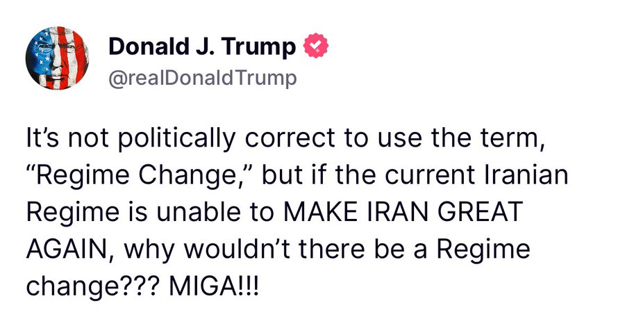 The defense for that post will be that Trump is trolling, or that he’s saying something extreme as a means to gain an advantage in negotiations, or that he means that the Iranian people should rise up and create their own regime change. Any of those interpretations could be true. But whatever his point, we absolutely cannot get involved in a regime change war. It’s not up to the United States to decide what sort of regime rules over Iran. Least of all is it our job to “make Iran great again.” The greatness of America is our only concern.