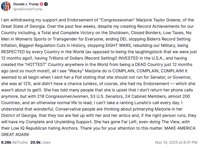 — Rep. Marjorie Taylor Greene🇺🇸 (@RepMTG) November 15, 2025