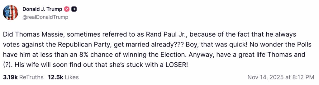 “Did Thomas Massie, sometimes referred to as Rand Paul Jr., because of the fact that he always votes against the Republican Party, get married already???” Trump posted to Truth Social. “Boy, that was quick!”