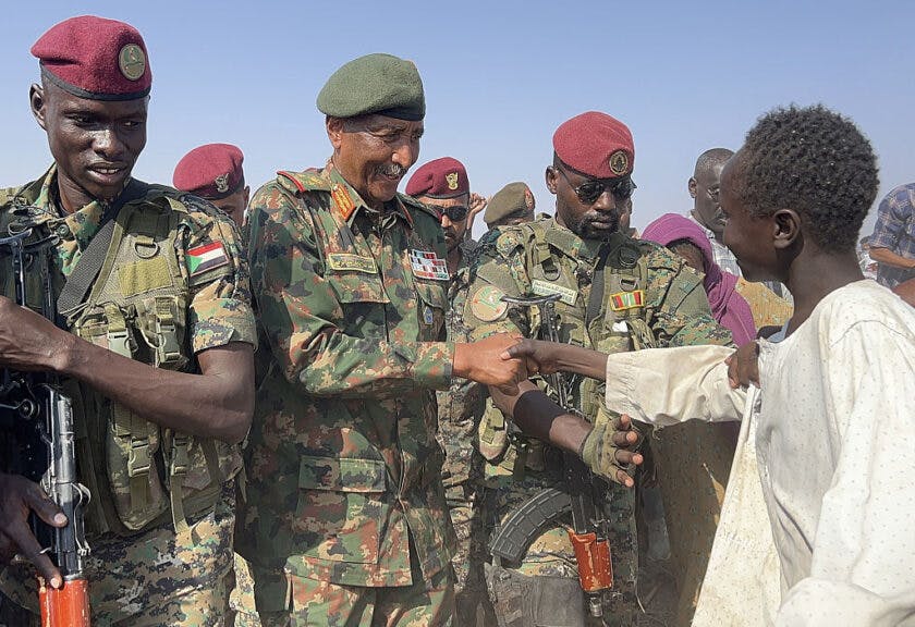 AL DABBAH, SUDAN – NOVEMBER 8: Sudan’s Sovereignty Council Chairman and Army Commander Gen. Abdel Fattah al-Burhan visits the newly established Al-Afadh camp in Al Dabbah, Northern State, where tens of thousands of Sudanese have taken refuge after being displaced by clashes following the Rapid Support Forces’ takeover of El Fasher, the capital of North Darfur. (Photo by Stringer/Anadolu via Getty Images)